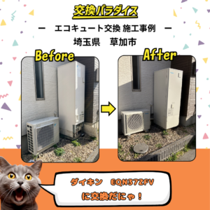 「急なトラブルで不安でしたが、交換パラダイスさんの迅速な対応と丁寧な説明のおかげで、安心して依頼することができました。新しいエコキュートは容量も大きく、家族みんなでお湯をたっぷり使えるようになったので、毎日のお風呂がより快適になることを期待しています。フェンス越しの搬入という難しい条件の中でも、お隣への配慮を完璧にしていただき、本当に感謝しています。」