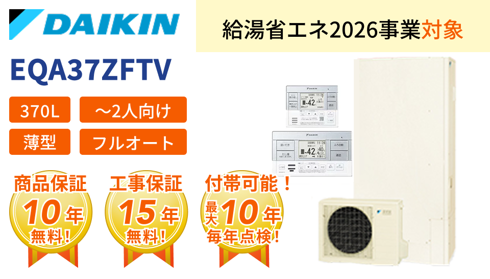 なかでも、今回おすすめのEQX37YFVは年間給湯保温効率3.7を実現しており、補助金も満額の13万円の対象となります。